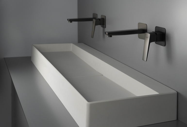 Uzupełnieniem kolekcji są umywalki z granitu wzbogaconego jonami srebra, wyposażone w elegancką maskownicę odpływu, która dyskretnie skrywa elementy instalacyjne. Możliwość zaprojektowania umywalek dla jednej lub dwóch baterii zapewnia komfort użytkowania, nawet dla dwóch osób jednocześnie.