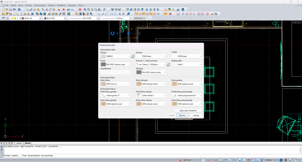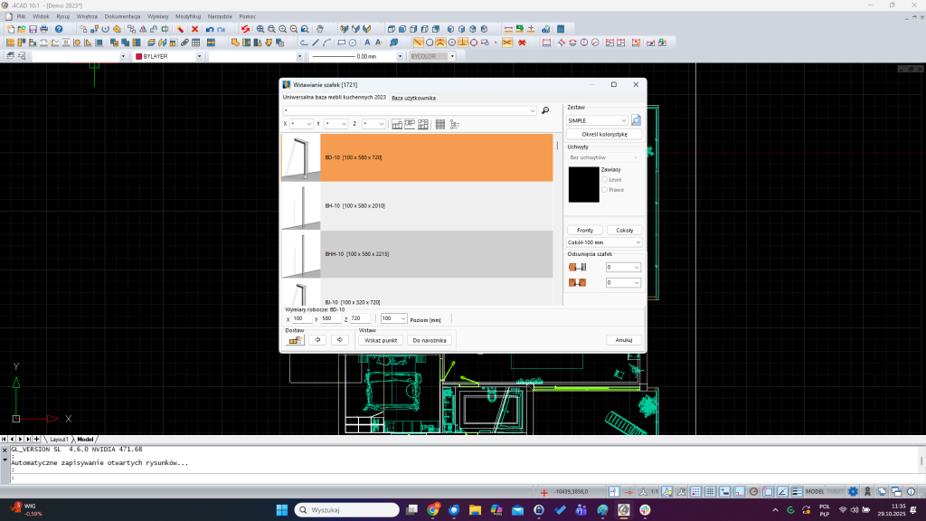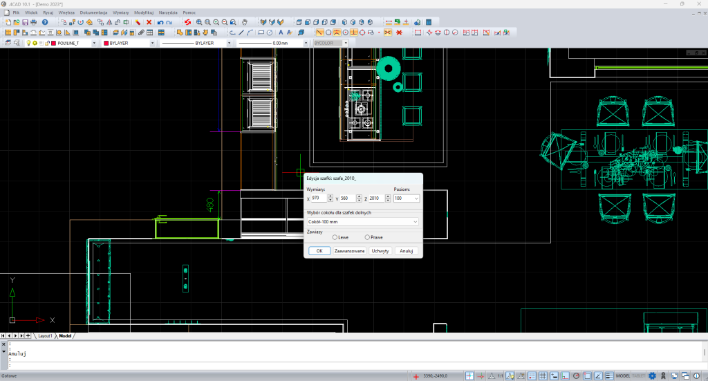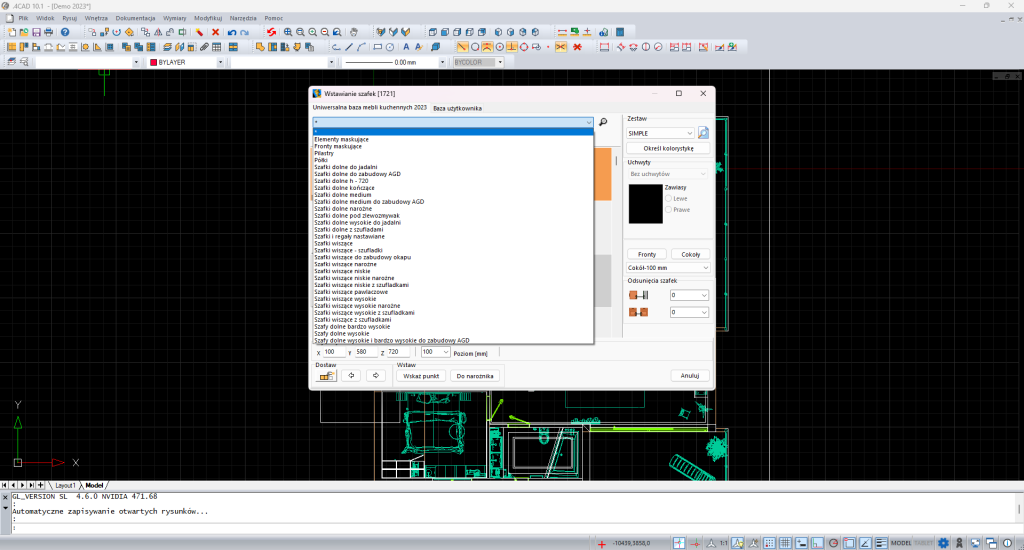 - „Dostaw do ostatniej” — program automatycznie „dokleja” kolejną szafkę do ostatnio wstawionej.