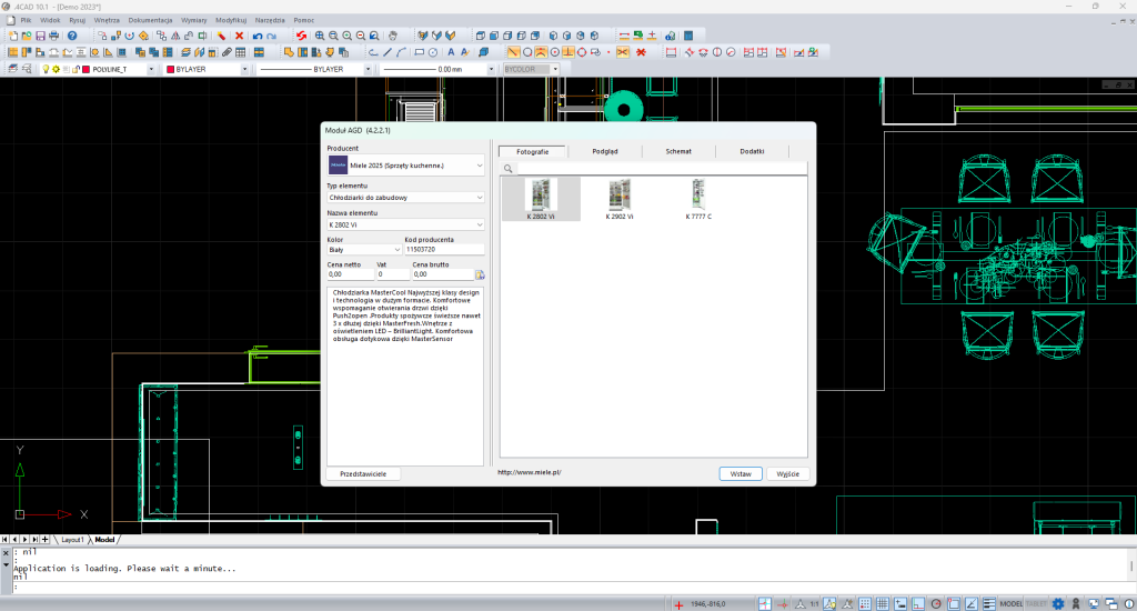 - Wstawianie urządzeń wolnostojących oraz do zabudowy z bazy producentów, wraz z podglądem, opisami i schematami montażowymi.