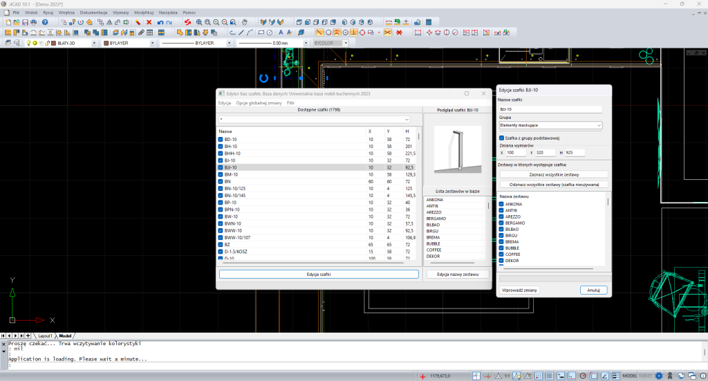 - Edytor zestawów pozwala na: zapisywanie zmian, dodawanie lub usuwanie szafek z zestawu, zmianę frontów, konfigurację uchwytów.