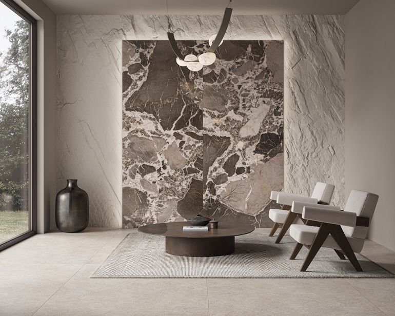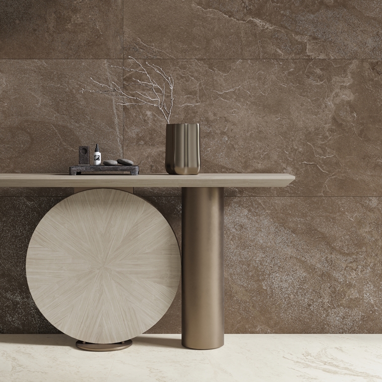 Pozostałe kolekcje to wariacje i reinterpretacje tego kamienia w różnych odsłonach, od subtelnych po bardziej wyraziste. Cristal Champagne zachwyca perłowym blaskiem i efektami trójwymiarowości, Proud Champagne prezentuje klasyczną elegancję z nadającymi głębię drobinami i żyłkowaniem, natomiast Urban Champagne oraz Soft Harmony wprowadzają spokojniejsze, harmonijne tonacje oparte na kamieniu mozaikowym. Storm Slate to dynamiczna gra wzoru i koloru, inspirowana nieokiełznanym charakterem naturalnych procesów. Wave Desert i Mild Desert reinterpretują trawertyn w cięciach vein-cut i cross-cut, dodając aranżacjom naturalnej lekkości. Z kolei Misty Rock oferuje wapienną subtelność, Soft Cream kremową elegancję, a Coffee Field – głębię ciemnych tonów, która doskonale wpisuje się w trendy kolorystyczne Pantone 2025.