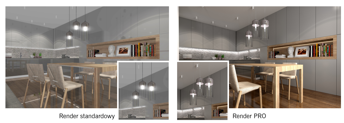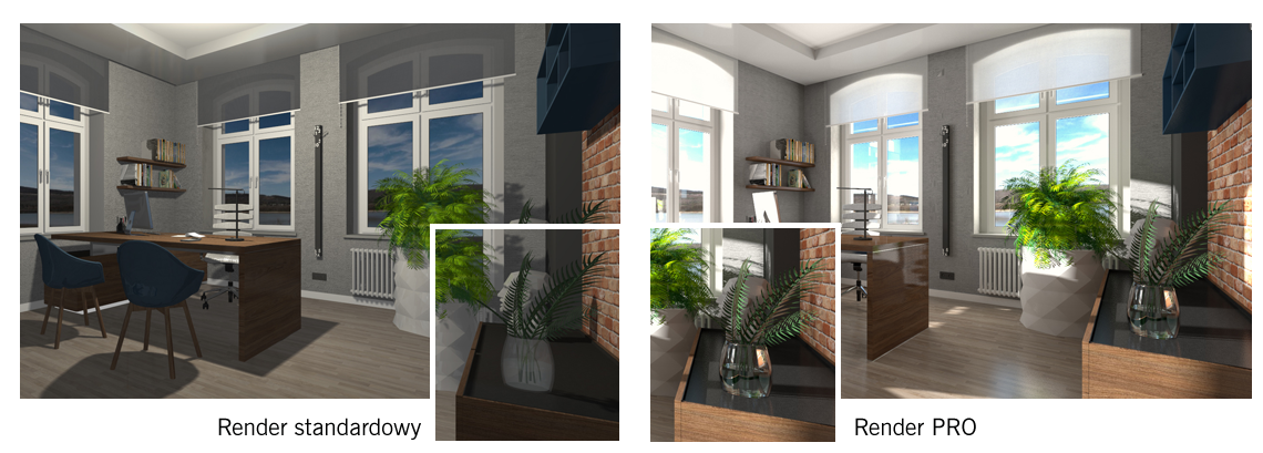 To nowoczesny moduł, dzięki któremu w prosty i przyjemny sposób wygenerujesz profesjonalną, fotorealistyczną wizualizację wnętrza. Główną zaletą narzędzia jest osiągnięcie doskonałej jakości przy stosunkowo krótkim czasie obliczeń. Moduł Render PRO sprawi, że Twoje projekty staną się jeszcze bardziej atrakcyjne i przyciągną uwagę klientów.