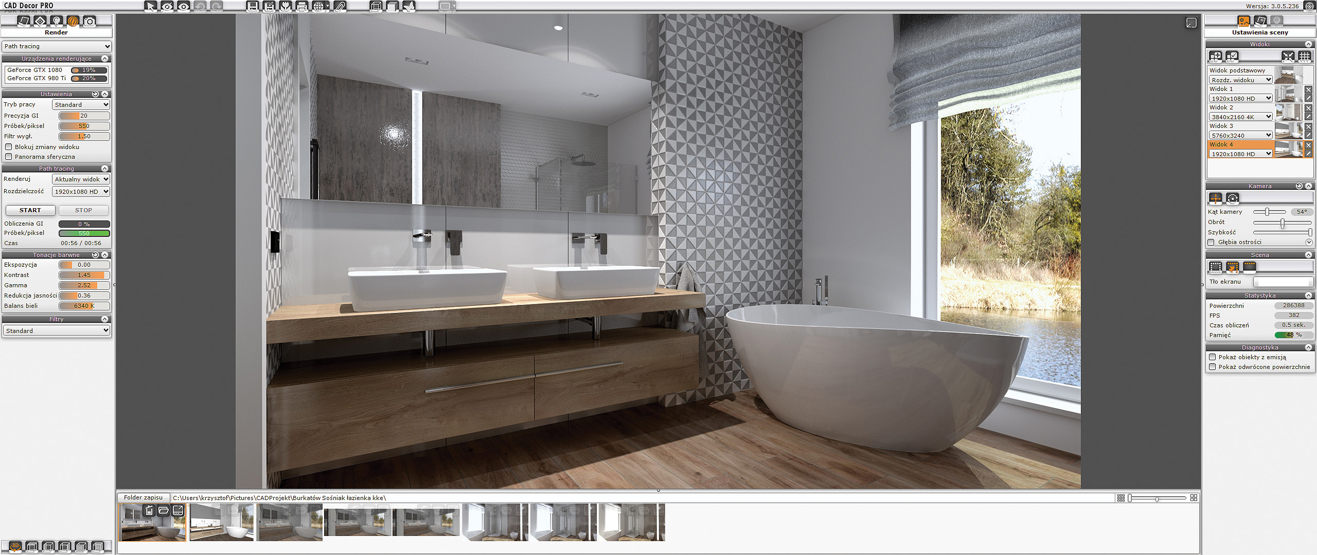 Nasza nowa metoda wyliczania oświetlenia globalnego, która dodatkowo analizuje również promienie odbite i załamane. Łączy więc działanie Radiosity i Ray tracingu. Polega na sprawdzaniu, czy do danego piksela trafia promień z wylosowanego źródła światła, z uwzględnieniem odbijania i pochłaniania światła przez różne powierzchnie (jedna taka próbka to tzw. sample, a program przeprowadza ich miliony, więc operujemy megasamplami). Analizowany jest każdy piksel z osobna. Obliczenia w trybie najwyższej jakości trwają dłużej od obliczeń Radiosity, ale dają jeszcze doskonalsze rezultaty, czasem nie do odróżnienia od prawdziwej fotografii! Renderowany jest jedynie aktualny widok, a efekty wyświetlają się na bieżąco na podglądzie w dole ekranu. Proces obliczeń jest interaktywny – w ich trakcie można zmieniać parametry materiałów np. odbicia i chropowatość, tryb pracy (np. z podglądu na wysoką jakość), rozdzielczość wynikowego obrazu, parametry tonacji barwnych i filtry obrazu. Moduł Render PRO w momencie użycia opisywanego algorytmu może obsługiwać wiele kart graficznych, a szybkość obliczeń jest skalowana proporcjonalnie do wydajności pojedynczej karty graficznej. Dzięki temu nasze programy potrafią renderować jedno ujęcie kamery równolegle nawet na kilkunastu kartach graficznych. Path tracing umożliwia również tworzenie ilustracji i animacji sferycznych (360o), w celu udostępniania ich na profilu osobistym lub firmowym na Facebooku.